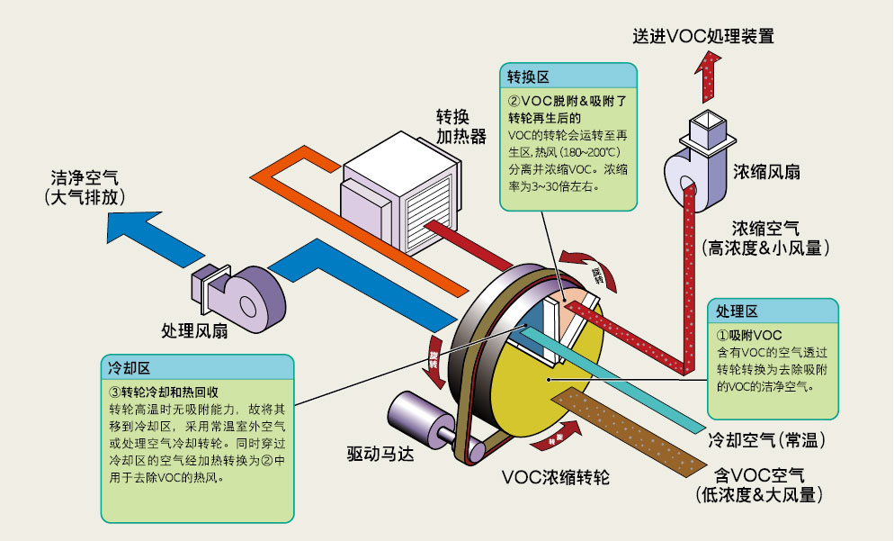 转轮分成吸附区、冷却区及脱附区。通过转轮的旋转,可在转轮上同时完成气体的脱附和转轮的再生过程。进入浓缩转轮的有机废气在常温下被转轮吸附区吸附净化后直接排放至大气,接着转轮进入脱附区,吸附了有机物质的转轮在此区内脱附,吸附在转轮上的有机物被分离、脱附、进入后续处理系统。如此循环工作。